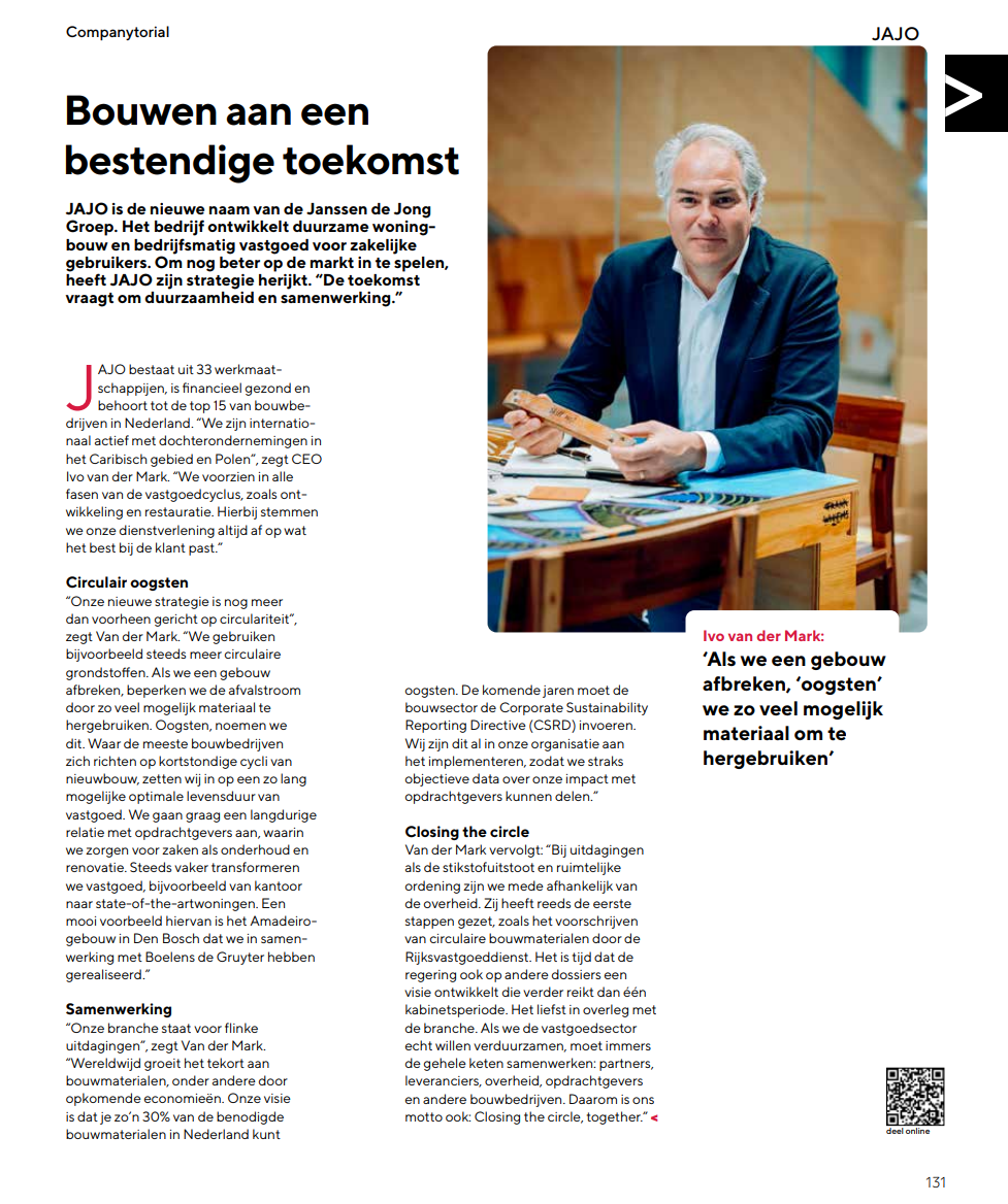 JAJO is de nieuwe naam van de Janssen de Jong Groep. Het bedrijf ontwikkelt duurzame woningbouw en bedrijfsmatig vastgoed voor zakelijke gebruikers. Om nog beter op de markt in te spelen, heeft JAJO zijn strategie herijkt. “De toekomst vraagt om duurzaamheid en samenwerking.”